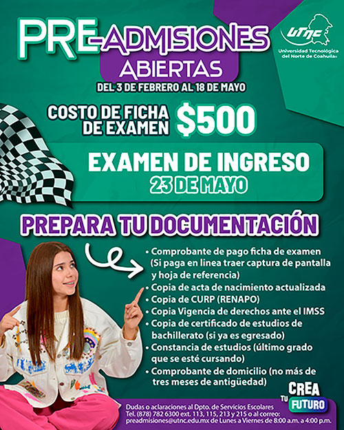 En la Universidad Tecnológica del Norte de Coahuila buscamos estudiantes con una amplia gama de experiencias. Por ello, nuestro proceso de admisión está enfocado en seleccionar jóvenes que tengan gran capacidad para convertirse en líderes con espíritu emprendedor, sentido humano y competitivos. Para nosotros es muy importante atraer candidatos que demuestren tener la capacidad y el entusiasmo para enriquecer su vida académica y estudiantil en la Institución.