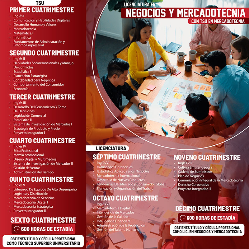 TSU EN MERCADOTECNIA Plan de estudiosPlan de estudios – Inglés Descargar plan de estudio LNYM ME LNYM_ME.pdf 224.9 KiB 6 Downloads Detalles Category:PLAN_ESTUDIOS Fecha:febrero 26, 2026 MAYORES INFORMES EN: Edificio Docencia 3 Teléfono: (878)-782-6300 Ext. 120 Correo: dnamylacs@utnc.edu.mx Director: Mtra. Alicia Villarreal Ruiz